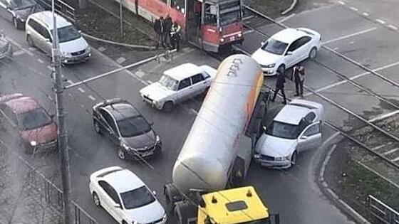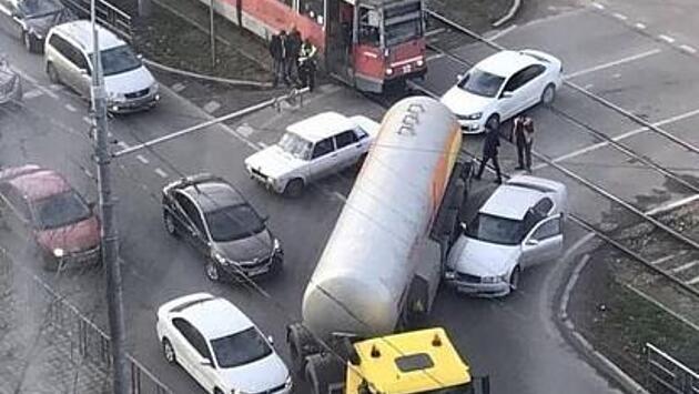В среду, 19 декабря, на пересечении улиц Трамвайная и Селезнева массивный бензовоз, поворачивая налево, протаранил две иномарки и остановился прямо на трамвайной линии.
