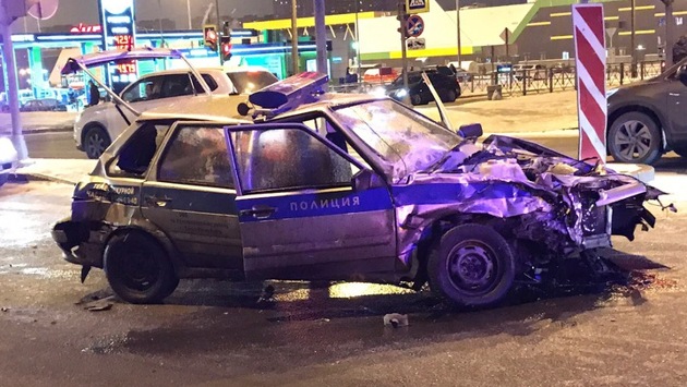 Попытка проскочить перекресток на желтый сигнал светофора закончилась для питерского водителя серьезным столкновением с автомобилем полиции. Момент ДТП попал в объектив камеры регистратора.