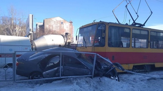 В Барнауле водитель Toyota Camry оказался в больнице после того, как его машину протаранил трамвай. Камера регистратора зафиксировала момент столкновения.