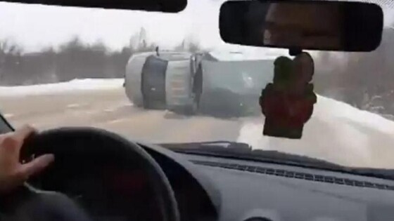 На дороге Тверь-Бежецк автомобиль перевернулся на льду и скользил дальше на боку