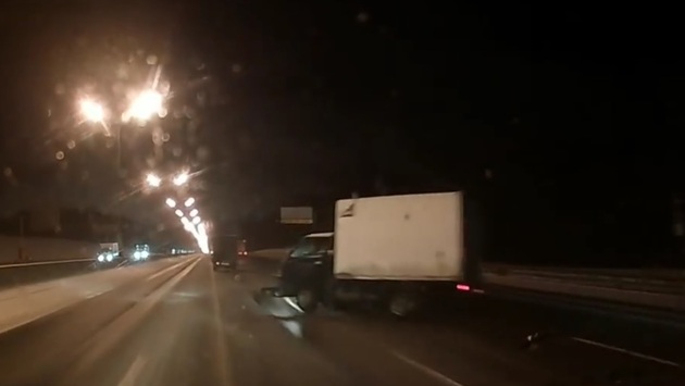 В районе пересечения МКАД с Рублево-Успенским шоссе водитель фургона Hyundai Porter, двигавшийся в крайнем правом ряду, не справился с управлением и резко вильнул в сторону, протаранив попутную легковушку.