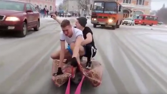 Накануне в YouTube появилось видео, на котором запечатлены два молодых человека, катающиеся на ковре по проезжей части в центре Нижнего Новгорода. Позже полицейские нашли владельца автомобиля, к которому было привязано необычное транспортное средство.