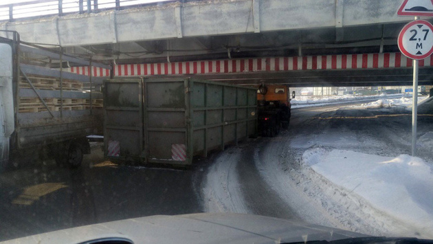 Под "мостом глупости" в Санкт-Петербурге снова застряли две машины. Общественный активист Олег Шляхтин на странице моста в Twitter написал, что аварий не было 55 дней, но сегодня там застряли "ГАЗель" и грузовик. На фотографии видно, что в подмостовом проезде, высота которого обозначена красно-белой разметкой, застрял мусоровоз с контейнером на прицепе. Это 163-я и 164-я машины, которым не удалось проскочить злополучный мост. КАМАЗ прошел, пухто не прошел. Коварный, да... pic.twitter.com/7OQXe1LB7m — Мост глупости (@FoolsBridge) 31 января 2019 г. Мост через левый приток реки Кузьминки на пересечении Софийской улицы и Ленсоветовской дороги был построен в 2009 году и передан в эксплуатацию в 2014 году, напоминает РИА Новости. На мост даже повесили плакат с надписью "Низкий мост. "ГАЗель" не проедет". Однако это не помогает, и машины продолжают там застревать. В "Мостотресте" подчеркивают, что мост полностью оборудован всеми предупреждающими знаками, в том числе и об ограничении высоты проезжающего транспорта до 2,7 метра.