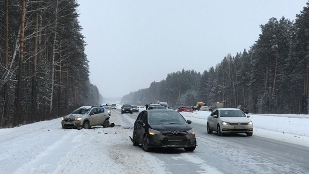 Массовое ДТП произошло утром 2 февраля на 173-м км Челябинского тракта. Его причиной, по словам участников, стал скользкий участок дороги. За примерно часовой промежуток времени на одном и том же месте случилось около десятка аварий, пишут пользователи соцсети "Вконтакте". "Скользко, колея, ветер поднимает снег с дороги, а водители гонят, не соблюдают дистанцию, резко на тормоза и — занос, — рассказывает Ольга (она едет с семьей на дачу). Прямо перед нами машину закрутило... Страшно... Полиция на месте, но машины продолжают биться. При мне одну занесло на уже битую". Водители не справлялись с управлением, грозя зацепить припаркованные у обочины транспортные средства. По их словам, по дороге было скользко передвигаться даже пешком. По данным ГИБДД Свердловской области, в авариях пострадали шесть машин. Водители и пассажиры, к счастью, остались невредимы. Через некоторое время после случившегося на место ДТП приехала машина, которая начала посыпать дорогу противогололедным материалом. Участники ДТП намерены объединиться, чтобы привлечь к ответственности тех, кто должен был бороться с гололедом на трассе. Фото: "Вконтакте" По информации "Уралинформбюро", этот участок дороги по контракту с "Уралуправдором" обслуживает ивановское ДСУ-1. Трасса является весьма оживленной, многие екатеринбуржцы едут по ней в свои загородные дома, из-за чего шоссе часто называют "уральской Рублевкой". Как сообщили в ГИБДД, днем неподалеку от этого места, на 162-м километре, произошло еще два ДТП с участием пяти машин. Сотрудники ГИБДД предупредили о необходимости соблюдать передний и боковой интервал с учетом погодных условий, а также исключить опасные маневры и обгоны. Фото: "Вконтакте"