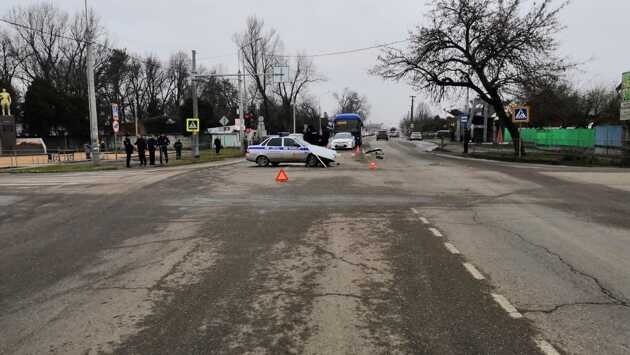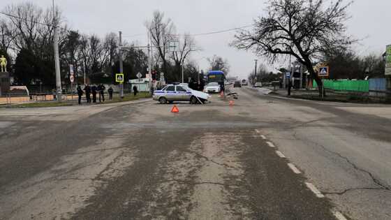 В Динском районе произошла массовая авария с участием патрульного автомобиля и Mercedes