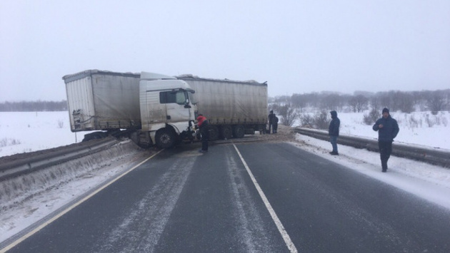 Большегруз развернуло поперёк дороги, практически блокировав проезд по федеральной трассе. Снегопад, заносы и перемёты - в начале недели стихия обрушилась на Самарскую область. По информации правоохранителей, сегодня, 18 февраля, 45-летний житель Белоруссии ехал на грузовике МАN в составе с полуприцепом по трассе М5 "Урал". На 869 км мужчина не справился с управлением - многотонная машина пошла в занос. Фура снесла отбойник и встала поперёк дороги, тем самым серьёзно усложнив проезд по этому участку трассы. На место происшествия выехали правоохранители, они организовали реверс. Правда, с 16:30 было объявлено ограничение движения грузовиков с 835 по 974 км трассы М5 - это Самарская и Ульяновская области. К счастью, в этом ДТП обошлось без пострадавших, сообщает начальник ОИОС ГУ МВД России по Самарской области полковник внутренней службы Сергей Гольдштейн. Фото:ГУ МВД России по Самарской области