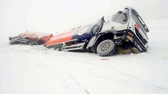 Отмечается, что грузовики провалились под наледь, незамерзающий участок горной реки, а инцидент случился в начале февраля, но инспекторы смогли добраться на место происшествия только 18 февраля.