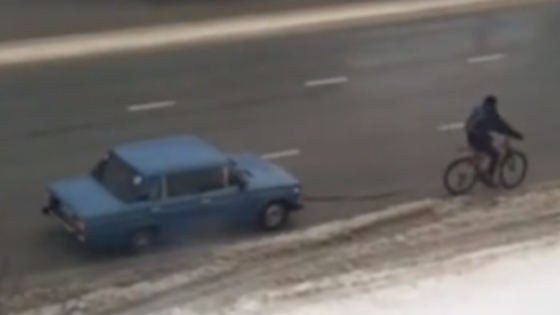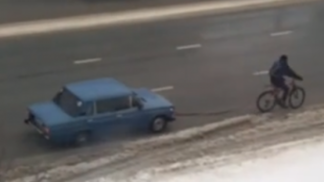 Житель Казани снял на видео, как велосипедист отбуксировал легковой автомобиль. Ролик разместили в социальной сети «ВКонтакте». На кадрах видно как мужчина с трудом крутит педали, а за ним едет машина, прикрепленная тросом к велосипеду. Проехав пару метров, велосипедист подошел к водителю, после чего ролик прервался. По словам пользователей социальных сетей необычный инцидент произошел напротив одного из многоэтажных домов по улице Аделя Кутуя. Видеоролик, размещенный сегодня утром, уже набрал почти шесть тысяч просмотров.