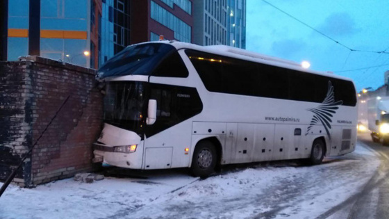 Туристический автобус влетел в кирпичную пристройку в Петербурге - видео