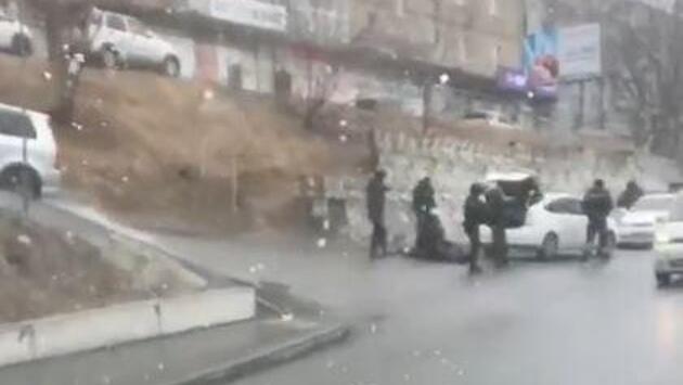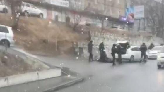Во Владивостоке бурное обсуждение получил дорожный инцидент в районе улицы 50 лет ВЛКСМ, сообщает PRIMPRESS. Видеозапись произошедшего появилась в соцсетях. На кадрах видно, как целая толпа полицейских окружила автомобиль Toyota Prius. При этом рядом с машиной на дороге головой вниз лежит мужчина. Оказалось, что это водитель авто, который работал таксистом. Подробности задержания автомобилиста неизвестны, но судя по всему, причина оказалась весьма серьезной, учитывая, какое «маски-шоу» устроили ради поимки одного человека. На видео четко видно, что некоторые силовики были в масках, бронежилетах и с оружием наперевес. Как утверждают некоторые очевидцы, водитель сбил пожилую женщину на дороге и скрылся. Однако эта информация пока не имеет официального подтверждения. Инцидент вызвал бурную реакцию у приморцев в Сети.