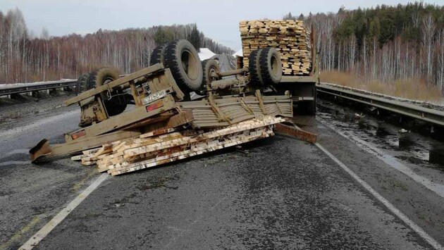 Дорожники пострадали после опрокидывания прицепа с досками в Удмуртии