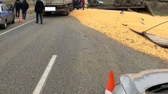 На Ставрополье посреди трассы перевернулся зерновоз и перекрыл дорогу