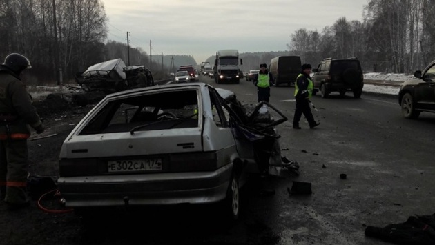 В объектив регистратора очевидца, оказавшегося утром в пятницу, 22 марта, на трассе М-5 неподалеку от города Снежинска в Челябинской области, попал момент аварии с летальным исходом. Водитель автомобиля "Газель", предположительно, решил совершить обгон и выехал на полосу встречного движения, где на полном ходу практически лоб в лоб столкнулся с ВАЗ-2114. В результате ДТП травмы различной степени тяжести получили шесть человек. Как сообщалось ранее, один из них скончался в больнице через некоторое время после инцидента. Состояние еще одного пострадавшего, вызвавшее опасения у врачей, удалось стабилизировать, в настоящее время оно оценивается как тяжелое.