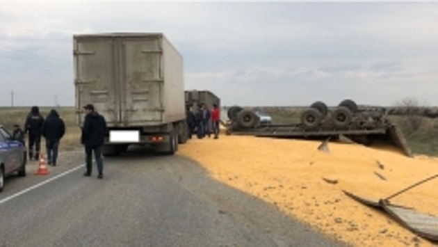 В Ставрополье на трассе перевернулся КАМАЗ с зерном