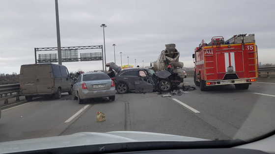 Массовая авария с участием пяти автомобилей произошла на внешнем кольце КАД в Санкт-Петербурге. В результате столкновения с бетономешалкой внедорожник Infiniti превратился в груду метала. Водитель чудом уцелел. Об этом сообщили «Невские Новости». Авария произошла вечером 22 марта на внешнем кольце КАД в сторону аэропорта Пулково. Японская иномарка врезалась в бетономешалку. В результате автомобиль разбился всмятку. Сам водитель уцелел. По словам очевидцев произошедшего, пострадал один человек. В результате ДТП у Таллинского шоссе образовалась серьезная пробка длиной в несколько километров.