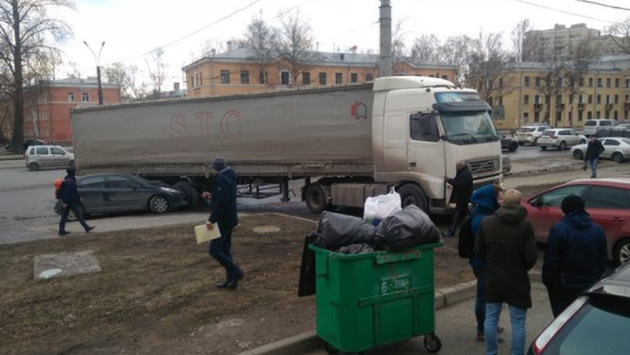 Наехавшая на автомобиль фура стала причиной затора движения в Санкт‐Петербурге