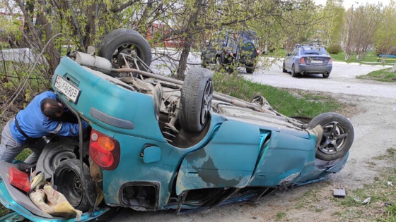 Прохожий помог двум девушкам выбраться из перевернувшейся машины с газовыми баллонами