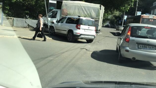 В центре Саратова Skoda протаранила знак пешеходного перехода