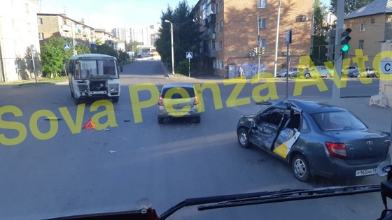 Сегодня утром в Пензе, вблизи дома № 3 на улице Металлистов, произошло ДТП: столкнулись автобус марки «ПАЗ-4234» и легковой автомобиль «LADA Granta» с символикой «Яндекс. Такси». В отделе пропаганды УГИБДД УМВД России по Пензенской области сообщили, что в результате аварии пострадал мужчина 1995 года рождения, находившийся за рулем Гранты. Медики оказали ему помощь на месте. По факту случившегося организована проверка. Фотография: vk.com/sova_penza