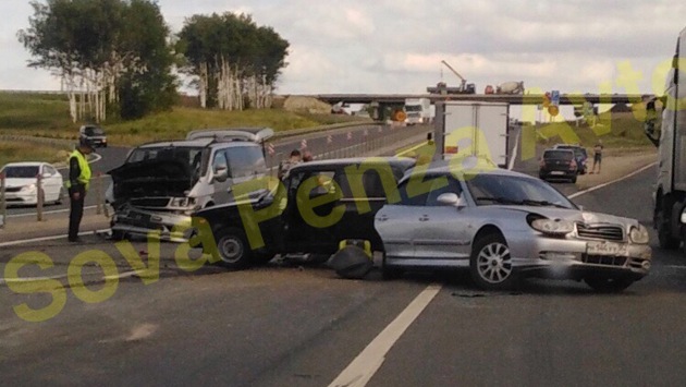 Массовое ДТП с участием четырех авто произошло накануне около 16:00 на трассе М5 «Урал» под Пензой. В нескольких пабликах в соцсети «ВКонтакте» разместили фото и видео с места аварии. Один из очевидцев написал: «Трасса М5 (недалеко от «Чистых прудов») в сторону Пензы, перед строящимся мостом — ДТП (на две полосы) из нескольких машин». По предварительной информации, на данном участке автодороги столкнулись «Хендай Соната», «Рено Логан», «ВАЗ-2107», и минивэн. У минивэна деформирована передняя часть кузова, у авто корейского производства практически отсутствует багажник. Логан получил удар в заднюю часть кузова, наименьшие повреждения — у «семёрки». Информация о пострадавших в ДТП на данный момент отсутствует. Фотографии: Мария Бугреева vk.com/sova_penza (1, 2, 3)
