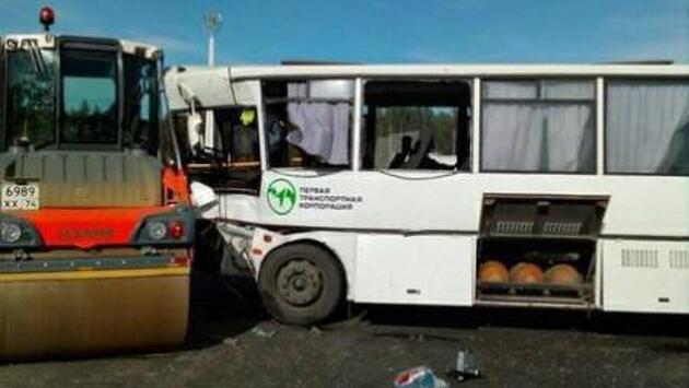 После удара бензовоза автобус пролетел еще несколько метров и врезался в стоявший на обочине каток. На этом участке ведется дорожный ремонт.