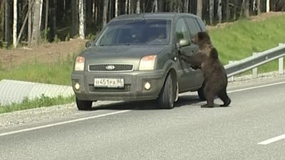 Два медведя-подростка решили подобраться ближе к людям и выбрались из леса прямо на дорогу. Они вплотную подошли к автомобилю, в котором находилось двое людей. Похоже, что медведи были очень голодны. Самый смелый из них начал своей мордашкой стучать в стекло и даже забрался на багажник авто. Пассажиры, пребывавшие в салоне, не на шутку испугались. Успокоившись немного, они решили немного подкормить животных. Довольные медвежата полакомились вкусностями и отпустили автомобиль. Биологи не советуют гражданам кормить диких животных. Медведи могут привыкнуть к легкой добыче и перестанут искать себе еду самостоятельно.