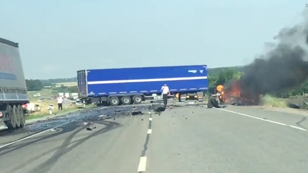 Камера наблюдения запечатлела момент страшного ДТП, произошедшего утром в среду, 17 июля, на объездной дороге под Ростовом в Аксайском районе Ростовской области. Камера наблюдения запечатлела момент столкновения, а очевидцы сняли на видео последствия аварии. Судя по записи, водитель легкового автомобиля выехал на полосу встречного движения, где лоб в лоб столкнулся с фурой. После удара машину, двигавшуюся по "встречке", отбросило в сторону, и она вспыхнула. Ее водитель скончался на месте инцидента. Полицейские устанавливают все обстоятельства произошедшего.