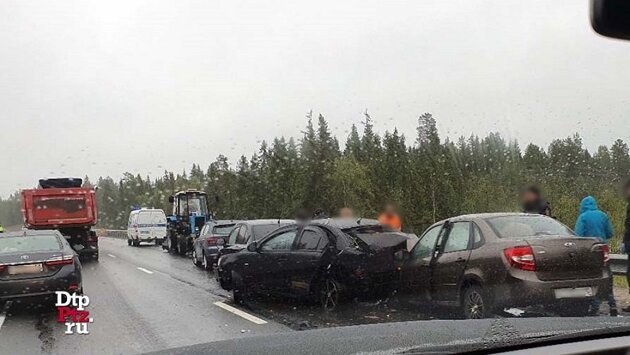 Одновременно 3 автомобиля столкнулись вчера, 30 июля, в 14.45 на 356-м километре автодороги «Кола». Предположительно транспортные средства двигались во встречном направлении. В результате ДТП один из водителей погиб, четыре человека получили травмы. Как информирует паблик «ДТП Петрозаводска и Карелии», на место дорожной аварии выезжали спасатели Пряжинского района, медицинские бригады из Олонецкой и Пряжинской ЦРБ. Следственная группа выясняет все обстоятельства произошедшего, причины ДТП устанавливаются. За последние трое суток это уже третья авария на трассе «Кола» с человеческими жертвами. Два дня назад на 390-м километре автодороги «Кола» в лобовом столкновении погиб водитель Hyundai Matrix и был ранен водитель второго автомобиля, 29 июля также в лобовом столкновении погибли четыре человека. 26 июля при опрокидывании автомобиля в кювет погибла 59-летний пассажир, жительница Мурманской области. Видео из группы "ДТП Петрозаводска и Карелии"