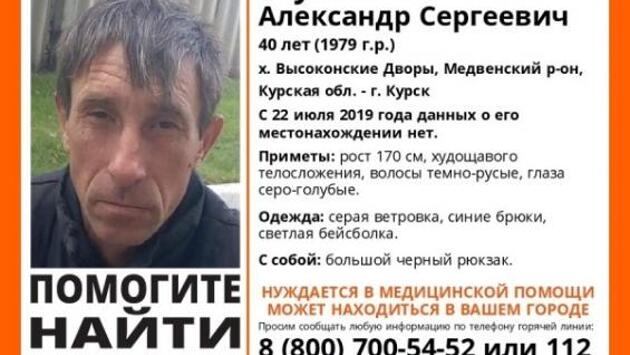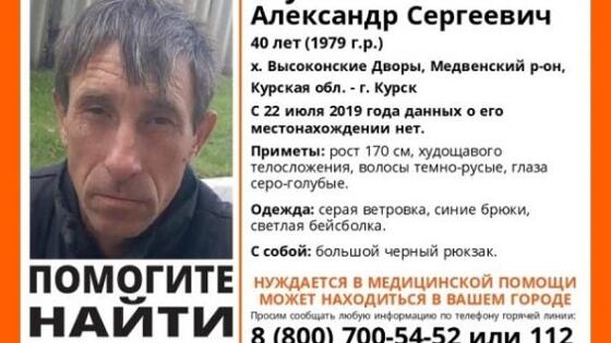 Поисковый отряда «Лиза Алерт Курск» просит о максимальном распространении информации о пропавшем жителе региона. Сообщается, что бесследно исчезнувшему Александру Шумакову 40 лет, он проживает на хуторе Высоконские Дворы Медвенского района Курской области и с 22 июля никаких сведений о нём не имеется. Приметы: рост около 170 см, худощавого телосложения, темно-русые волосы, серо-голубые глаза. Был одет в серую ветровку, синие брюки и светлую бейсболку, при себе носил большой черный рюкзак. Всех, кто что-либо знает о местонахождении пропавшего курянина, просят позвонить по телефонам 8 800 700 54 52 или 112. Читайте также - Водитель на «Волге» в Курске сбил пешехода и скрылся с места ДТП фото vk.com