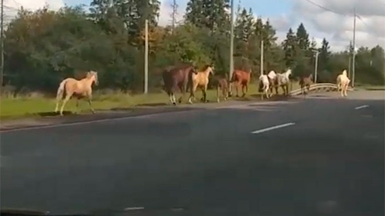 Под Петербургом на проезжей части заметили бегущих лошадей: видео