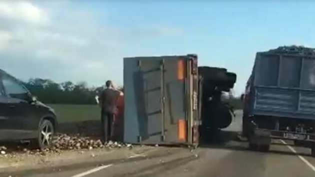 На трассе в Краснодарском крае перевернулся груженный свеклой КамАЗ