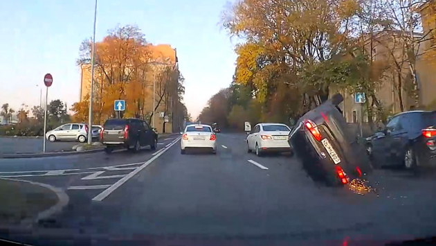 Во вторник на Приморском проспекте в Санкт-Петербурге легковой автомобиль не сумел проскочить между другими участниками движения. Седан на высокой скорости уткнулся во внедорожник, подпрыгнул, перевернулся, пустил сноп искр и несколько десятков метров скользил на боку, стирая двери и крылья об асфальт. По словам очевидцев, в результате аварии никто не пострадал.