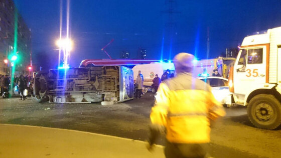 В Питере маршрутка с пассажирами влетела в трамвай и перевернулась