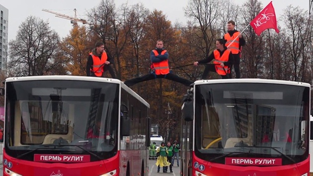 Акробат студии оригинального жанра Егор Тунгусков на конкурсе профессионального мастерства среди водителей автобусов в Перми повторил знаменитый трюк актера Жан-Клода Ван Дамма, сев на поперечный шпагат между двумя разъезжающимися транспортными средствами.