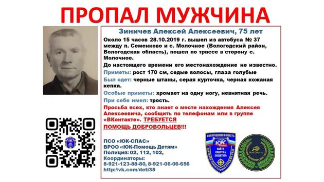 75-летний Алексей Зинчев пропал 28 октября. Около 14.00 на остановке в центре Вологды он сел в автобус № 37 до Молочного, но до дома так и не доехал. Поисково-спасательный отряд «Ты не один» призывает пассажиров и водителей с видеорегистраторами помочь в поиске. Приметы мужчины: рост 170 см, голубые глаза, седые волосы, ходит с палочкой и прихрамывает, говорит плохо, очень застенчив. Был одет в черные штаны, серую куртку и кожаную кепку. Всем, кто видел пенсионера, просьба сообщить по телефонам: 102 (полиция), 8 911 505 68 98 (волонтеры). Дополнительная информация в группе поискового отряда в соцсети.
