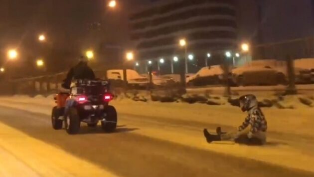 Этой ночью в Екатеринбурге двое парней устроили необычный заезд по ночному городу. Один из них управлял квадроциклом, другой – ехал на привязанной к нему покрышке. Врезаясь в сугробы на дорогах, молодые люди проехали от ТРЦ «Мега» до Цирка. Гонщик на покрышке позаботился о своей безопасности — надел шлем. Очевидец встретил экстремала на парковке у ТРЦ «Мега». Заинтересовавшись необычным занятием парней, он поехал за ними. «Всю дорогу чувак сидел в покрышке. Ну, я и не удержался — включил камеру», — поделился Александр с Е1. Ночной заезд прокомментировали в ГИБДД Екатеринбурга. Действия водителя квалифицируются по ч. 2 ст. 12.23 Кодекса РФ об административных правонарушениях – за это ему грозит штраф в размере 1000 рублей. «Водитель своими действиями поставил под угрозу жизнь и здоровье пассажира, которого перевозил вне транспортного средства. Подобные действия — как со стороны водителя, так и пассажира — являются недопустимыми и потенциально опасными», — отметили в ГИБДД. Если экстремалов удастся найти, штрафа им не избежать. Фото превью: Е1