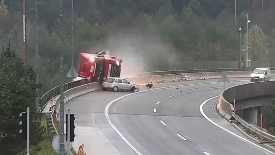 Камера наблюдения запечатлела момент серьезной аварии, произошедшей в минувшую среду, 13 ноября, на трассе в окрестностях Любляны. На записи видно, как водитель малолитражного автомобиля Opel Corsa не справился с управлением и врезался в попутную фуру. После столкновения дальнобойщик потерял контроль над грузовиком, врезался в ограждение и свалился с путепровода. Как сообщают СМИ, в результате падения с 20-метровой высоты 53-летний водитель фуры из Венгрии получил фатальные травмы. Он оказался единственным пострадавшим в этом ДТП.