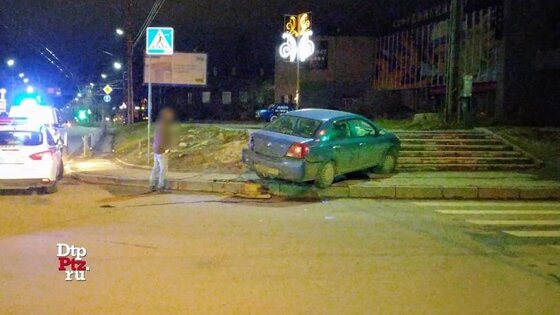 Легковушка в Петрозаводске не вписалась в поворот и вылетела на пешеходную лестницу