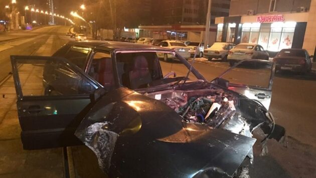 В Екатеринбурге пьяный парень на ВАЗ-2114 на большой скорости влетел в столб, в результате чего вся передняя часть автомобиля превратилась в груду металла. Молодой человек попал в больницу. Авария произошла на улице Малышева недалеко от дома № 154. Водитель ВАЗ-2114 на большой скорости врезался в столб — удар был такой силы, что из-под капота автомобиля вылетел аккумулятор. Сам автомобилист серьезно пострадал – с черепно-мозговой травмой его доставили в больницу. По словам очевидцев, молодой человек был пьян и не справился с управлением. После столкновения отечественную легковушку откинуло на трамвайные пути. Фото: ИА «Ночные новости» Фото: ИА «Ночные новости» Весь салон автомобиля был в крови и стекле, лужицы крови и топлива остались и на дороге. Фото: ИА «Ночные новости» Фото: ИА «Ночные новости» Ранее ИА «Уральский меридиан» писало о том, что в Екатеринбурге парни на Toyota снесли забор на перекрестке Белинского и Саввы Белых, бросили машину и скрылись. Столбик забора пробил лобовое стекло иномарки — пассажир на переднем сиденье чудом остался жив. По словам очевидцев, молодые люди были пьяны. В Екатеринбурге парни на иномарке протаранили забор и бросили машину Фото: ИА «Ночные новости»