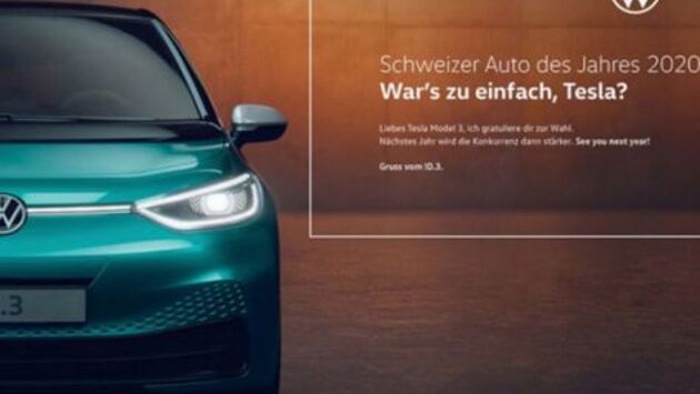 Компания Volksvwagen не скрывает, что в ближайшее время планирует занять нишу электрических автомобилей, уже совершив дебют своей модели компактного хэтчбека ID.3, производство которого уже стартовало. Теперь же бренд потролил Tesla после церемонии награждения «Автомобиль года». Церемония награждения "Автомобиль года" прошла недавно в Швейцарии. Двенадцать экспертов присудили премию модели Model 3 от Tesla, тогда как компания Volkswagen и вовсе не попала в список претендентов на победу, так как серийно электрические автомобили бренд не выпускает. Также Tesla Model 3 стала «Любимым автомобилем Швейцарии» и «Самой зеленой машиной». Конкурент в лице немецкого производителя уже успел поздравить победителя с победой, в то же время дав намек на то, что в скором времени выведет на рынок более бюджетную электрическую модель. Компания Volkswagen оплатила публикации в журналах Schweizer's Illustrierte и L'Illustré, при этом указав, что в этом году одержать победу было легко, пообещав встретиться в 2020 году и передав привет от ID.3.