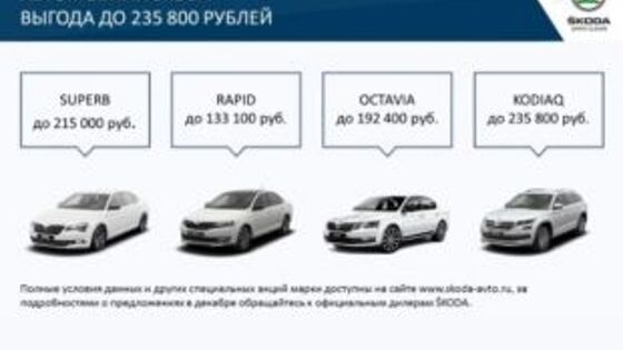 В преддверии нового года «Яромир Авто», официальный дилер ŠKODA в Челябинске, традиционно предлагает своим клиентам привлекательные условия на приобретение автомобилей марки. Так, при покупке флагманского SUPERB можно сэкономить до 215 000 рублей, а легендарной модели OCTAVIA – до 192 400 рублей. Увеличилась максимальная выгода при приобретении семейного внедорожника KODIAQ – до 235 800 рублей – и для компактного лифтбека RAPID – до 133 100 рублей. По-прежнему можно воспользоваться популярной программой Утилизация/Трейд-ин, которая дает возможность клиентам ŠKODA сэкономить до 130 000 рублей в зависимости от сдаваемого автомобиля. Предложение действует для всего модельного ряда марки 2019 года выпуска. «Яромир Авто» официальный дилер ŠKODA в Челябинске Свердловский тракт, 5Р Тел: (351) 211 44 11 https://www.yaromiravto.ru/ *Выгода достигается при покупке автомобиля RAPID Ambition с пакетом WE7 2019 года выпуска, при условии сдачи своего автомобиля по системе трейд-ин (приобретение автомобиля с принятием в зачет стоимости прежнего автомобиля). Выгода достигается при покупке модели ŠKODA OCTAVIA Ambition с пакетом WE8 2019 года выпуска, при условии сдачи своего автомобиля по системе трейд-ин (приобретение автомобиля с принятием в зачет стоимости прежнего автомобиля). Выгода достигается при покупке модели ŠKODA KODIAQ Ambition с пакетом WH1 при условии сдачи своего автомобиля по системе трейд-ин (приобретение автомобиля с принятием в зачет стоимости прежнего автомобиля). Выгода достигается при покупке модели ŠKODA SUPERB 2019 года выпуска, при условии сдачи своего автомобиля по системе трейд-ин (приобретение автомобиля с принятием в зачет стоимости прежнего автомобиля). *Основные условия кредитования ООО «Фольксваген Банк РУС» (далее Банк) на приобретение нового автомобиля ŠKODA по продукту «Кредит на приобретение нового автомобиля» валюта кредита – рубли РФ; сумма кредита от 120 тыс. до 4 млн. руб. Процентная ставка (в % годовых) при сроке от 12 до 60 мес. –11% при первоначальном взносе (далее ПВ) от 15% (включительно) и оформлении договора личного страхования, заключаемого в отношении заемщика. При отказе заемщика от заключения договора личного страхования процентная ставка составит– 15%. При ПВ менее 20% необходимо предоставление полного пакета документов. Обеспечение по кредиту – залог приобретаемого автомобиля. Условия кредита действительны на 01.12.2019 и могут быть изменены Банком. Информация по телефону Банка: 8-800-700-75-57 (звонок по России бесплатный). Лицензия ЦБ РФ № 3500, 117485, г. Москва, ул. Обручева, д.30/1, стр.2. www.vwbank.ru. На правах рекламы
