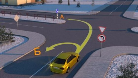 Предлагаем вашему вниманию дорожную ситуацию на нерегулируемом перекрестке неравнозначных дорог. Постарайтесь как можно скорее определиться с разрешенной траекторией для желтого автомобиля. Итак, вопрос: "По какой из предложенных траекторий разрешено движение желтому автомобилю?" Варианты ответов: по траектории "А"; по траектории "Б"; запрещены оба маневра; разрешены оба маневра. А пока вы размышляете о правильном ответе, мы обратимся непосредственно к ПДД. На предложенной картинке показан нерегулируемый перекресток (нет ни светофоров, ни регулировщика). Следовательно действовать нужно, опираясь на знаки. Перед желтым автомобилем мы видим знаки: 2.4. "Уступите дорогу" и 3.18.2. "Поворот налево запрещен". Последний запрещает поворот налево, но не разворот. Значит развернуться желтый автомобиль может. Что до самого поворота, то согласно правил, ограничение действует до первого пересечения дорог. А так как маневр запланирован во второе пересечение, то он разрешен тоже. Выходит, что правильным ответом на поставленный вопрос в данной дорожной ситуации будет вариант номер четыре: разрешены оба маневра. А как вы разрешили данную дорожную ситуацию? Поделитесь своими аргументами в комментариях.