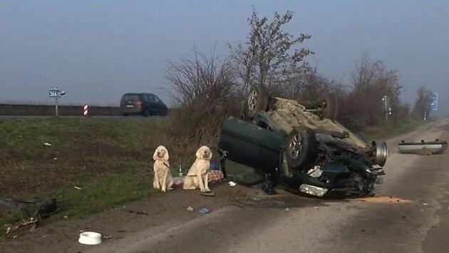 Две собаки, пережившие аварию, остались сидеть возле перевернувшегося автомобиля в Германии