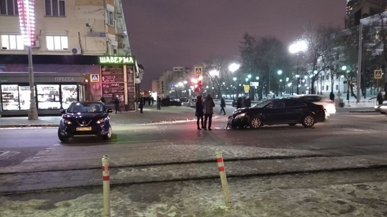 Дорожно-транспортное происшествие утром 13 января затруднило движение на перекрестке проспекта Ленина и улицы Мамина-Сибиряка в Екатеринбурге. Столкновение произошло около 8.30 утра. Как сообщают читатели "Уралинформбюро", автомобиль Nissan Qashqai поворачивал на Ленина с Мамина-Сибиряка. Черная Toyota Camry, двигавшаяся по улице Ленина, врезалась ему в борт на полном ходу. От удара Nissan развернуло почти на 180 градусов. Никто из водителей и пассажиров не пострадал.