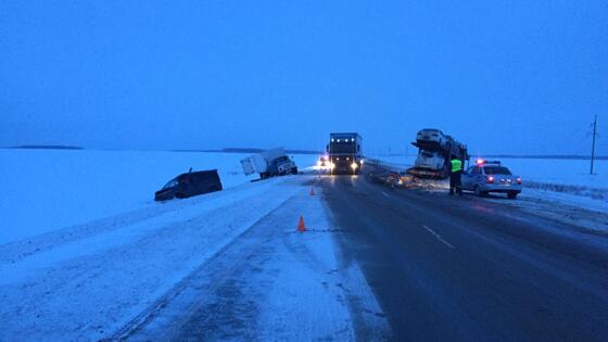 В Омской области произошла автоавария с участием грузовых машин и легковой иномарки. Крупное ДТП произошло сегодня, 17 января, на территории Любинского района. Согласно данным Госавтоинспекции, на трассе Тюмень - Омск водитель автомобиля Honda Stepwgn столкнулся с грузовиком "ГАЗ-53", который ехал впереди в попутном направлении. От удара "ГАЗ" выехал на полосу встречного движения, где столкнулся с большегрузом Volvo, который перевозил несколько машин. Все три транспортных средства вылетели с проезжей части. В автоаварии пострадали два человека. В больницу с травмами увезли водителя "ГАЗ" и 43-летнего пассажира "Хонды". По факту ДТП начата проверка, в ходе которой установят обстоятельства и причины произошедшего. Как ранее писал "Омск Здесь", омское управление Госавтоинспекции вчера предупреждало о том, что ситуация на дорогах ухудшится из-за мокрого снега, сильного ветра и гололёда. Осадки и потепление в регионе продолжаются, из-за чего пришлось закрыть дороги в Казахстан . В такую погоду водителей и пешеходов просят быть внимательнее. Фото: УГИБДД России по Омской области