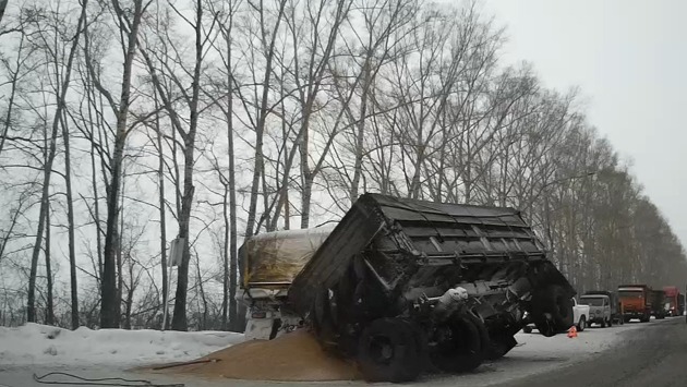 Прицеп с песком опрокинулся на трассе в Кузбассе
