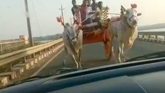 Владелец легковушки попал в затруднительное положение, когда прокладывая свой маршрут по мосту в городе Белгаум (штат Карнатака, Индия), оказался на месте проведения нелегального соревнования. Индийский автомобилист запечатлел, как в его стоящее транспортное средство врезались парнокопытные участники забега. Несмотря на усилия погонщика, сидящего в телеге, предотвратить столкновение не удалось и одно из животных помяло капот и разбило лобовое стекло в автомобиле. Гонки на телегах запрещены в Индии и виновные могут оказаться в тюрьме за участие в подобных мероприятиях. Несмотря на то, что такие повозки довольно распространены на индийских дорогах, следует отметить, что они не подпадают под действие законов и, следовательно, дорожная полиция не может просто так штрафовать участников движения, пока они соблюдают правила. Кроме того, эти повозки не имеют каких-либо отражателей, поэтому очень трудно разглядеть их в темноте, особенно на оживлённых автотрассах.