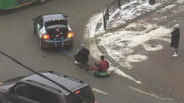 По центру Екатеринбурга трое подростков катались на снегокате и «бублике», привязанным к арендованному «Делимобилю». Третий юноша фотографировал своих друзей на телефон, сидя в багажнике машины. Экстремалов снял на видео сотрудник екатеринбургской радиостанции Максим Путинцев и выложил ролик в Facebook. Молодёжь развлекалась неподалёку от Главпочтамта, на перекрёстке улицы Толмачёва и проспекта Ленина. Согласно правилам ПДД, перевозка людей на автомобиле вне кабины запрещена. За нарушение водителю «Делимобиля» положен административный штраф. Остановили ли нарушителей сотрудники ГИБДД, в настоящий момент неизвестно. Фото: Страница Максима Путинцева на Facebook