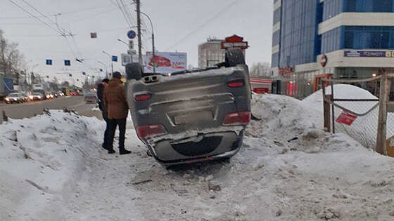 «Вот это сальто – даже сугроб не задел». На крышу приземлился кроссовер KIA, которого вынесло с проезжей части на тротуар. Судя по вмятине на правом борту, такому развитию событий предшествовало столкновение, сообщает «АСТ-54». Автомобиль остановился в метре от трубы газоснабжения. По данным паблика «Инцидент Новосибирск», водитель получил травму руки – вывих или перелом. Сотрудники ГИБДД и водитель эвакуатора помогли пострадавшему стабилизировать автомобиль. Увиденное поразило подписчиков пабликов: «Вот это сальто – даже сугроб не задел. Кааааааааак они это делают?» Один из них предположил: «На взлет, похоже, пошел, но крылья в гараже оставил». Ранее VN.ru сообщал, как неунывающий водитель в Новосибирске отнесся с юмором к тому, что его внедорожник Mitsubishi Montero перевернулся и замер вверх колесами. Молодой мужчина вскарабкался на перевернутую машину, позируя для автокомиссаров. Фото с позитивным водителем облетело новосибирский интернет.