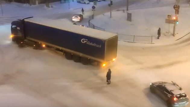 Снежным вечером, 26 февраля, на улице Мельникова в Екатеринбурге во время подъёма в горку в сугробе забуксовала фура. Водитель фуры долго не мог совершить манёвр, чтобы выехать обратно на дорогу, так как проезжавшие мимо автомобили ему мешали, не желая пропускать. На помощь водителю фуры пришла проходившая мимо женщина. На видео, выложенном в паблике «[ТЕ] Типичный Екатеринбург» ВКонтакте, видно, что женщина подошла к водителю фуры и объяснила ему, как удобнее проехать, чтобы не заезжать в горку. Когда водителю удалось сдвинуть фуру с места, женщина показала ему жестами, в какие моменты можно двигаться, чтобы удачно выехать. За всё время, пока женщина помогала выехать фуре, никто один из водителей не остановился, чтобы помочь. Видео: Алексей Фомин, паблик «[ТЕ] Типичный Екатеринбург» ВКонтакте, фото превью: скрин с видео